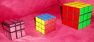 Joey has 3 Rubik's Cubes. Two are the normal 3x3 square blocks, one regular size and one jumbo size. His third one is a bit tricky (I have yet to solve it), it has a silver mirror tint on all sides and composed of 3x3 varying rectangle sizes. So when you jumble up the cube, it creates an odd shape (see below) .