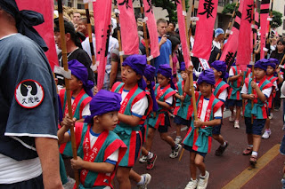 In the beginning of the tug of war main event, there's a parade with Eisa dancers and people marching and carrying large decorated poles like the one seen in the front of the picture shown above.