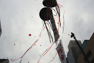 Once the Ryukyuan Kings are done, they leave, the gold ball in the sky opens up and releases confetti and balloons, and then the tug of war begins!